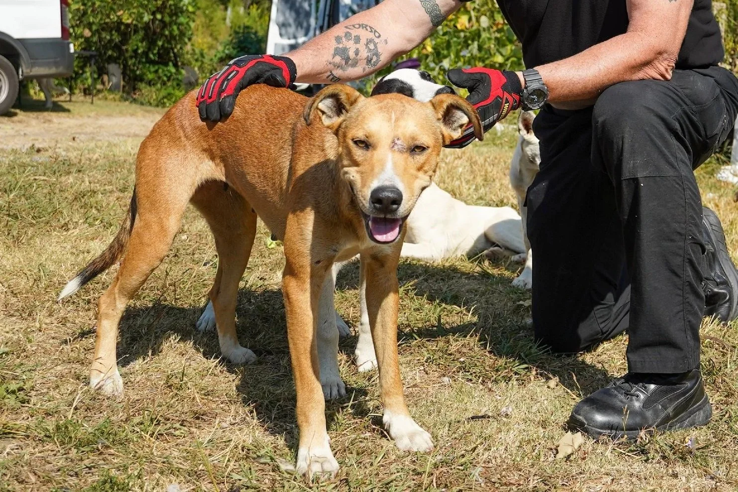 Our teams worked for extended hours in hazardous conditions, crawling beneath trailers and navigating tight, unstable spaces to reach animals who had been living unseen and unprotected. Several puppies were trapped underneath a trailer, unable to escape on their own. Adult dogs showed clear signs of prolonged neglect, both physically and behaviorally.